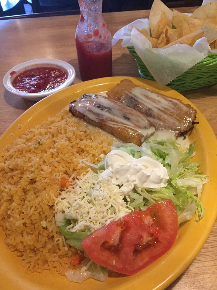 Two rolled com tortillas with chicken or beef, deep-fried to a golden brown. Served with lettuce, pico de gallo, guacamole, sour cram, rice and beans.